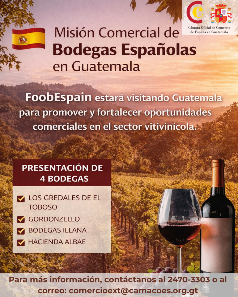 Como parte de las actividades de la Cámara Oficial de Comercio de España en Guatemala para fortalecer y promover las relaciones comerciales entre Guatemala y España, se estará recibiendo una Misión Comercial organizada junto a FOOBESPAIN, empresa española especializada en la representación e internacionalización de bodegas de vinos.